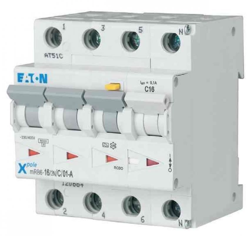 | Вимикач диференційний автоматичний mRB6 3+N-пол. кат. D Eaton | 6,0kA | 100mA | 6, 10, 13, 16A |