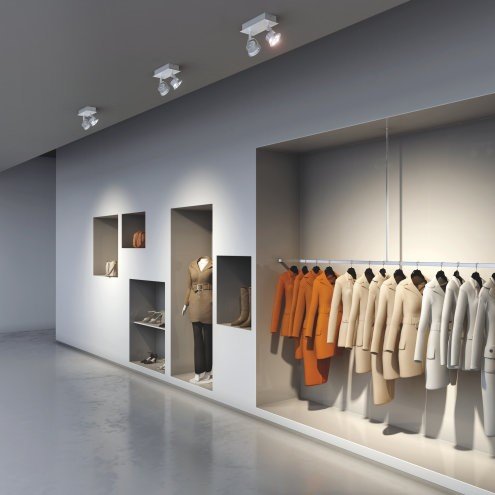 Після одягу приходить дизайн самого магазину. Оскільки магазини стикаються зі зростаючою конкуренцією в інтернет-магазинах, то ніколи так, як раніше інтер'єрний дизайн магазину не був настільки важливим для підвищення якості обслуговування клієнтів. Тут, як і в моді, мова йде про накладання шарів освітлення. По-перше, загальне (або навколишнє) освітлення - основне джерело світла. Навколишнє освітлення задає тон і атмосферу простору. Від теплого і затишного до прохолодного і гострого, воно повинне відображати бренд і стиль магазину. Пам'ятайте: необхідний зовнішній вигляд може змінитися в залежності від пори року або навіть часу доби, тому установка дімміруємих ламп або інтелектуального освітлення може заощадити час і енергію. Крім того, накладення одягу в фокус (як описано вище), можна використовувати акцентне освітлення, щоб підкреслити архітектурні особливості, такі як стовпи або ніші. Крім того, світлодіодні смуги можуть бути включені в меблі, наприклад, вздовж стелажів або за областю відображення.