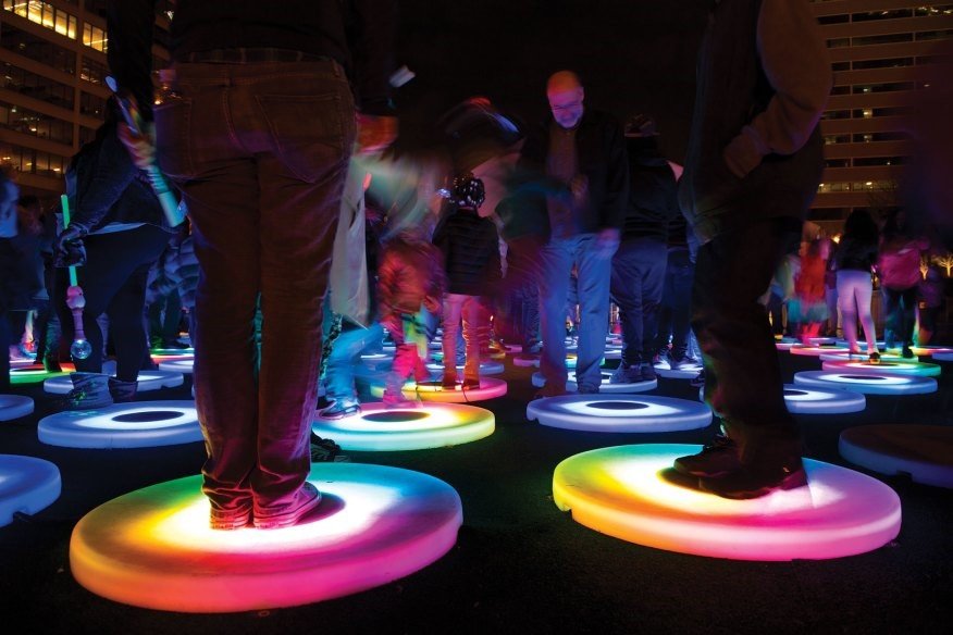 Рік тому навесні прогулюючись по гавані Балтімора можна було побачити дивну картину: натовп людей зібрався біля води. Як правило, гавань була практично безлюдною після настання сутінків, а тепер на тротуарі поруч з гаванню, здавалося, танцювали сотні людей. Незабаром з'ясувалося в чому причина: інтерактивне відображення кругових вогнів на землі під назвою «Пул». Установка, виконана художником Jen Lewin, складалася з спеціалізованих оболонок з поліетилену, що містять різнобарвні світлодіодні смуги, що реагують на рух. Діти і дорослі сміялися і стрибали, коли грала музику, а диски зміщувалися.